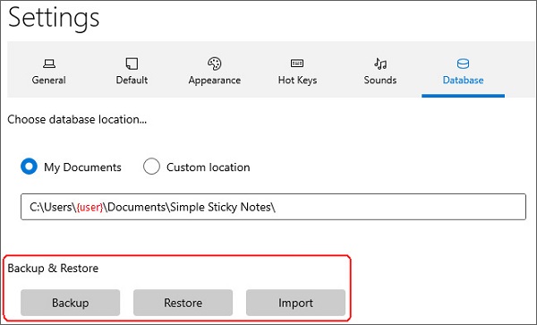 ● Notes.db文件存储在c:\用户\{用户}\文档\简单便笺\文件夹(如果您没有更改数据库位置)