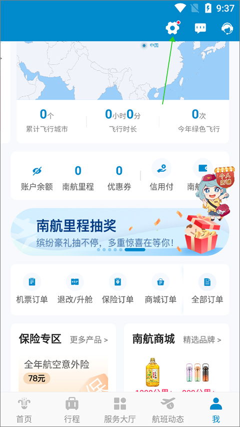 1、进入南方航空app中的【我的】页面中,点击右上角第一个设置图标(下图绿色箭头所指)