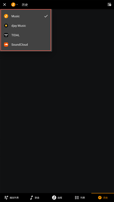 2、有四个选择音乐的方式分别为:Music、Djay Music、TIDAL、SoundCloud。