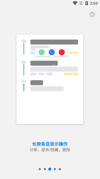 3、长按日记条目显示操作,隐藏/分享/删除