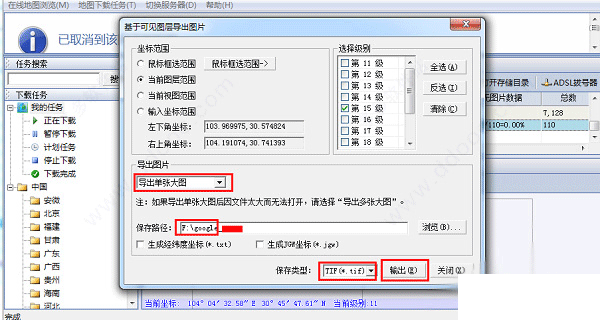 8、选择导出图片是单张大图还是切片,确定保存路径,选择图保存片类型,点击“输出”。