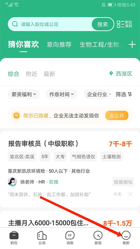 1、打开汇博招聘app,选择右下方“我的”选项,