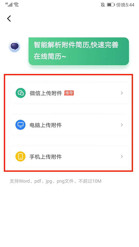 2、进入到个人中心界面,选择“使用附件更新简历”选项,
