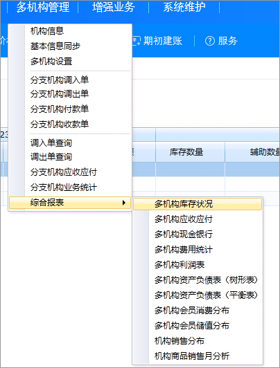 查看多机构的库存、应收应付、现金、会员、业务财务类报表【注意,如果有启用总账,综合报表中当前不统计总账财务数据】