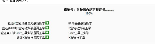 6、系统会通过客户提交的参考号和授权码来判断客户证书介质类型,根据客户使用的 K 宝类型,系统会自动检测客户端软件是否为最新版本、客户端 K 宝软件是否安装正常、客户端 CSP 工具是否正常以及 K 宝连接是否正常。如图所示: