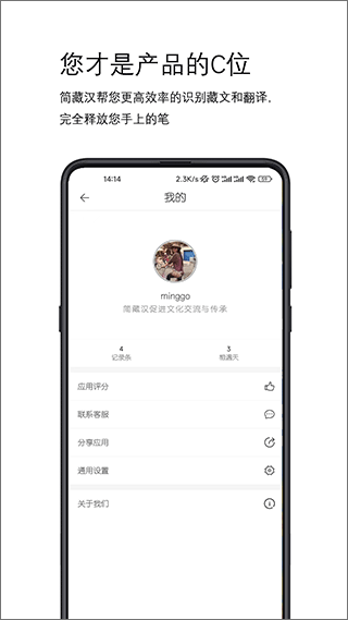 主页面就是一个识别页面,而选择藏文,汉文扫描或者相册导入进行识别,减少各种功能的跳页繁琐。