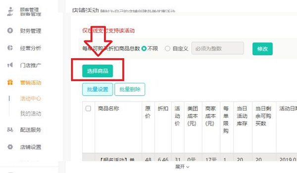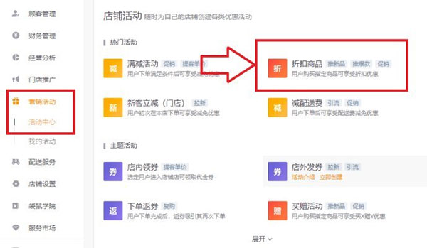1、打开美团外卖商家版电脑版软件,打开软件后点击点击左侧的【营销活动】点击【活动中心】,在右侧界面中点击【折扣商品】选项。