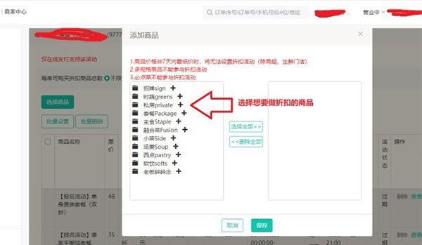 3、选择您要添加折扣的商品就可以了,选择完成后点击【保存】。