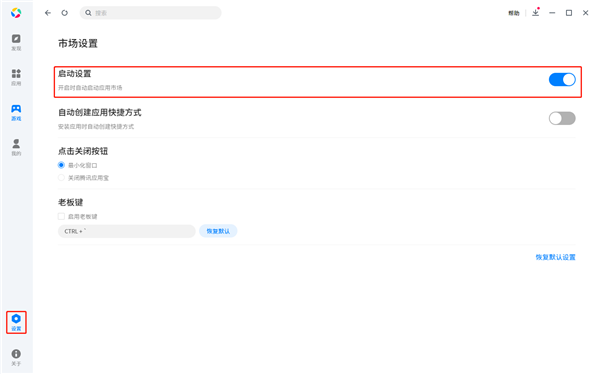 1、在设置中选择启动设置,勾选“开启时自动启动应用市场”