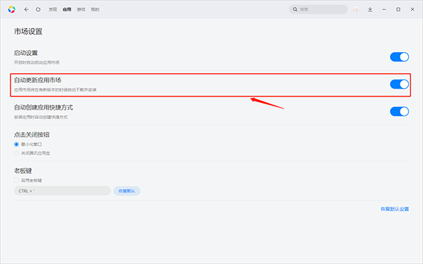3、在“设置”页面可以看一个“自动更新应用市场”,点击开启即可。