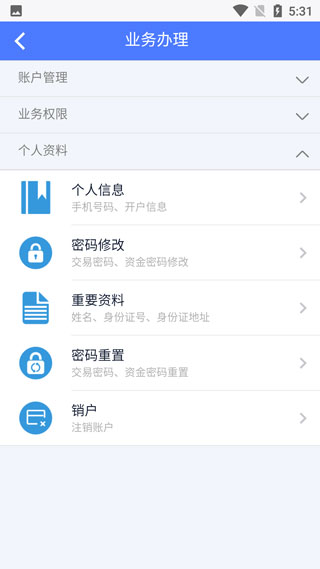 2、在业务办理模块下,拥有账号管理、业务权限、个人资料等等三大模块。