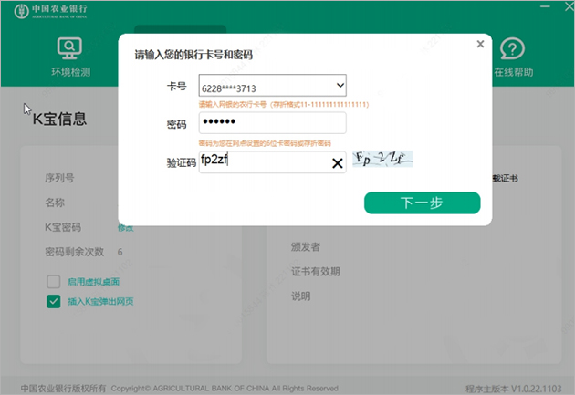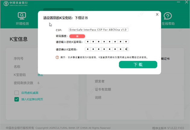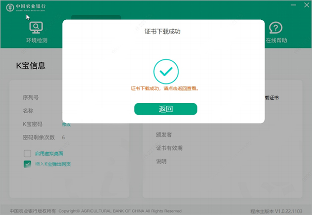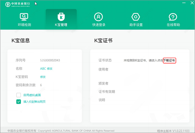 目前农行网银证书下载需要使用中国农业银行网银助手才能下载更新,软件包中已经附带了,同时新申请k宝用户需确认k宝已插入电脑;
