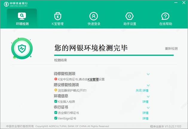 插入 K 宝,运行网银助手,自动开始进行系统环境检测修复。