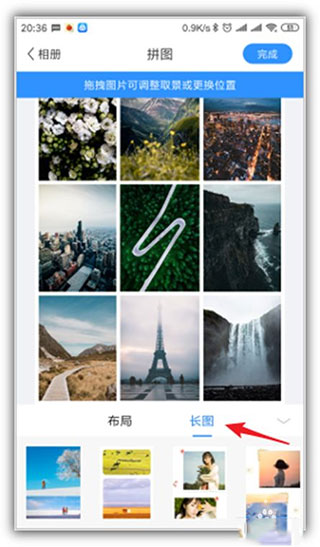 2、然后从手机中选择最多9张图片,点击右上角的拼图。