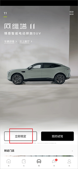 1、打开阿维塔汽车app,在车界面中点击立即预定