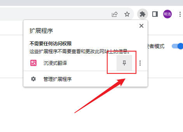 6、点击右上角插件容器找到刚刚安装的插件,点击图钉按钮将插件固定在顶部导航栏