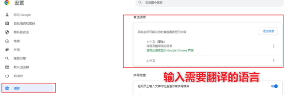 3、点击首选语言,进行设置输入你想要翻译的语言即可