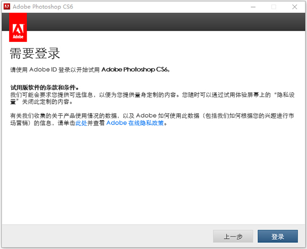 5、此步需要登录刚才我们创建的Adobe ID,如果之前没有创建ID的则可以在点击登录后的页面中创建。但由于我们已经断开了网络,可以不登录;