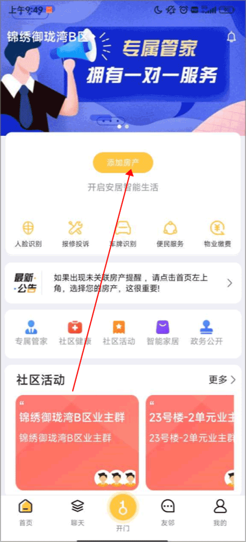 1、打开这款安居公社app;进入首页,在首页中点击添加房产,如图所示。