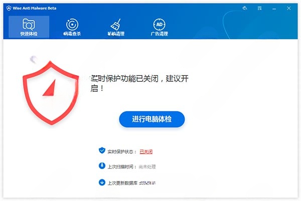 Wise Anti Malware最重要的特性是实时保护,它将第一时间保护你的电脑免受恶意程序的侵扰。它有三个主要的防护盾牌,即恶意软件检测、广告软件检测和注册表保护。
