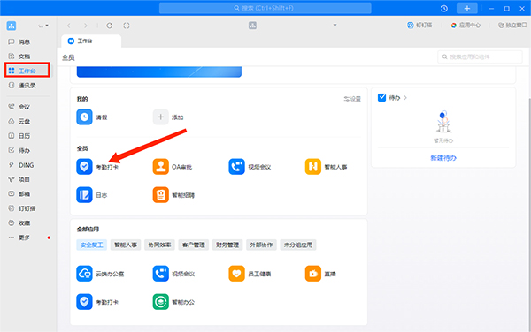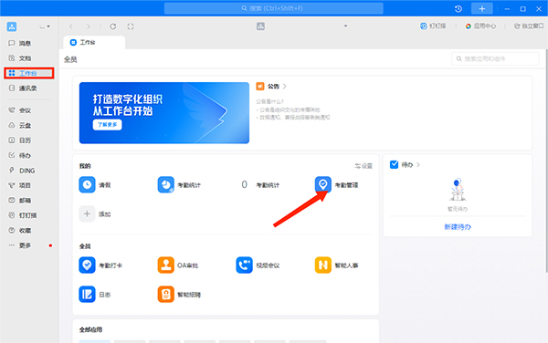 1、打开钉钉电脑版软件,进入【工作台】任务栏,选择【考勤管理】选项,