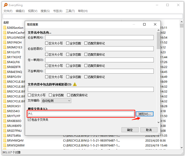 4、打开高级搜索,在搜索文件夹中默认是空的,这样搜索时就会搜索所有内容,要搜索U盘的话,点击右边的浏览按钮,选择U盘;