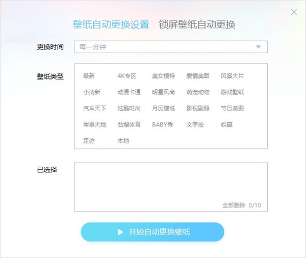 一键开启自动换壁纸功能,您无需指定图片,只需要指定您喜欢的图片分类,并且在指定的时间间隔内,自动为您更换壁纸,让您的桌面天天都有新的气息!