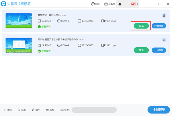 第三步:等待视频修复完毕,点击预览按钮,视频能正常播放即修复成功。