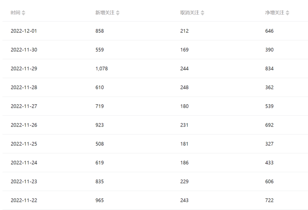 以阿水自己为例,目前全网50W+粉丝,这是每天的涨粉数据,我最近没有刻意引流,仅仅靠着以前在其他平台发布后的长尾流量,每天都能有将近1000+的新增关注,除去取关的,平均保底也有500+。