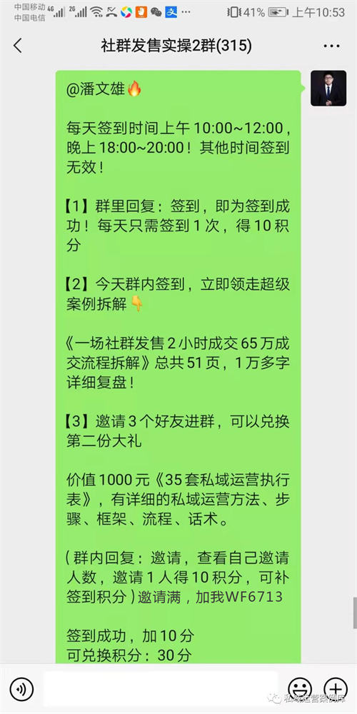 签到累积多少天,就可以兑换礼品:比如在群里签到累积3天,就可以得到一份《实操案例复盘:一场社群发售活动,2小时成交65万》