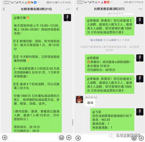 要学会控场,通过话术引导,先让群内一部分人邀请起来,后面就会有很多人参与,你的邀请礼品,要有高诱惑、高价值、低成本、客户想要的、能够解决客户某个问题的,那么你的社群就可以轻松裂变起来了。比如我送的一份《35套私域运营执行表》,每天都有很多人自发邀请好友。